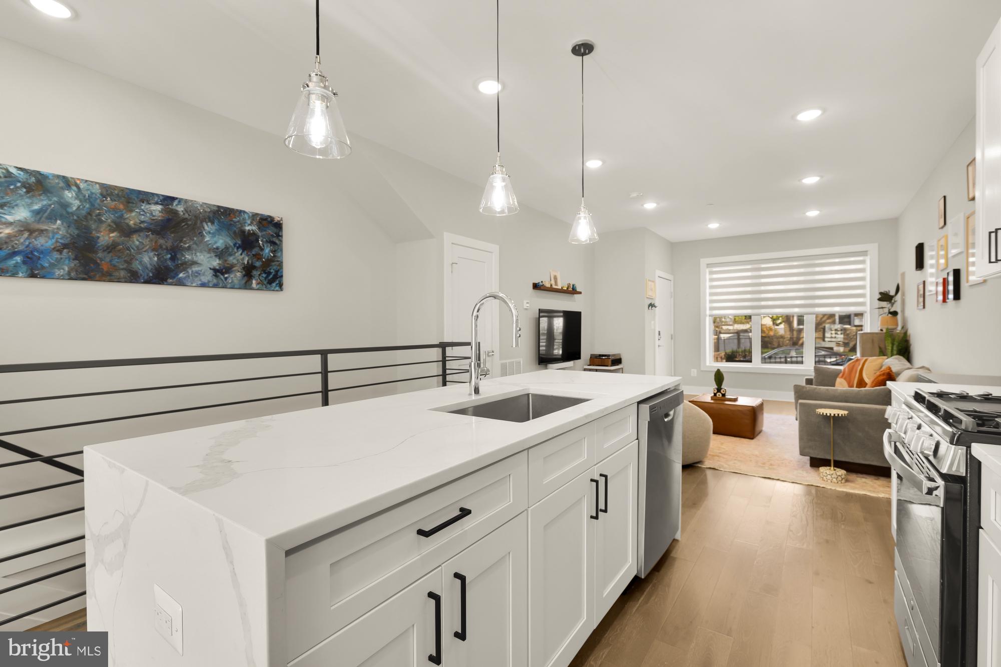 Step inside to find open-concept living with high ceilings, oversized windows, and beautiful wood flooring throughout. The chef's kitchen features sleek quartz waterfall countertops, stainless steel appliances, soft-close cabinetry, and a large 4-seater island. Spacious adjacent living and dining spaces are perfect entertaining or casual nights in.
