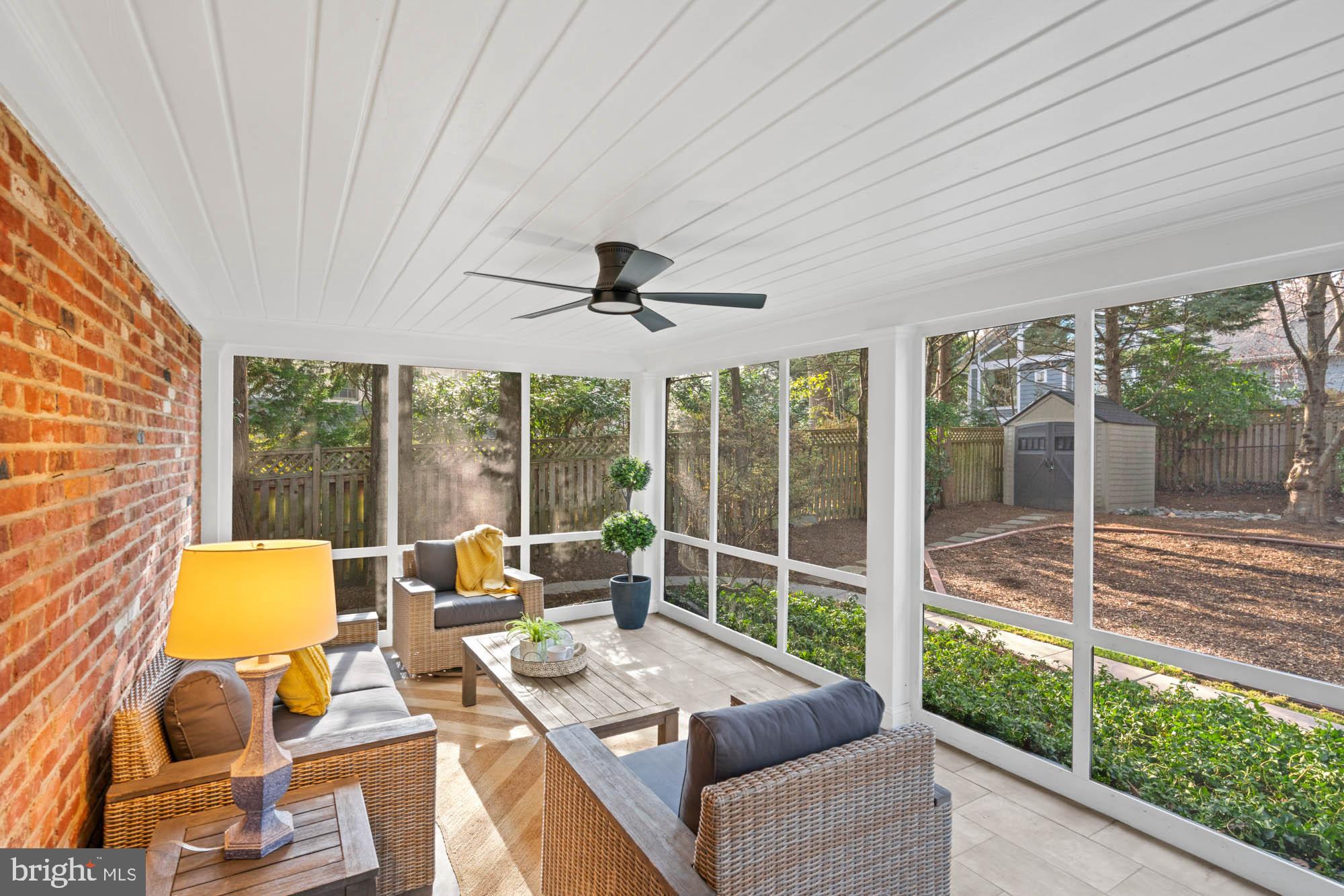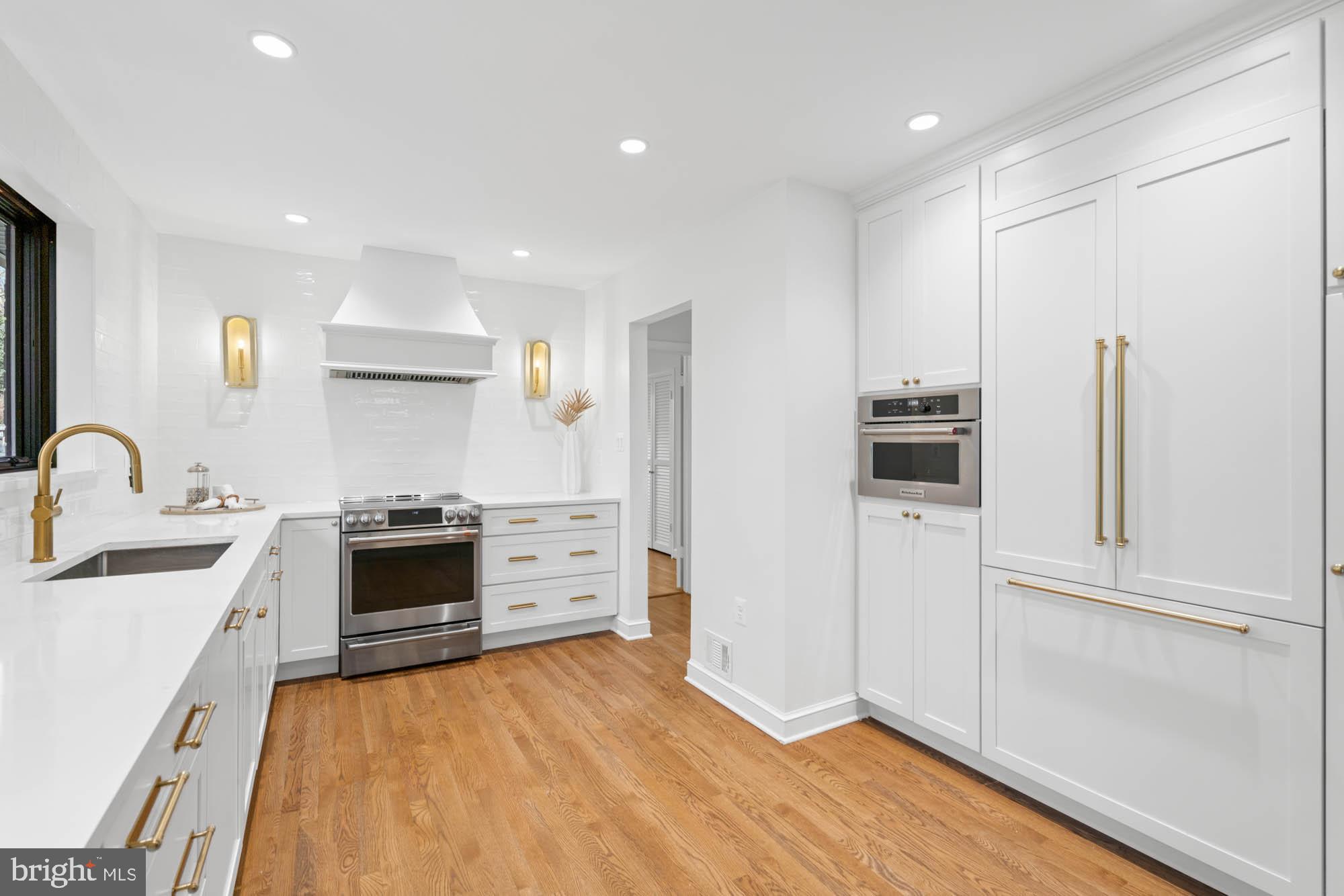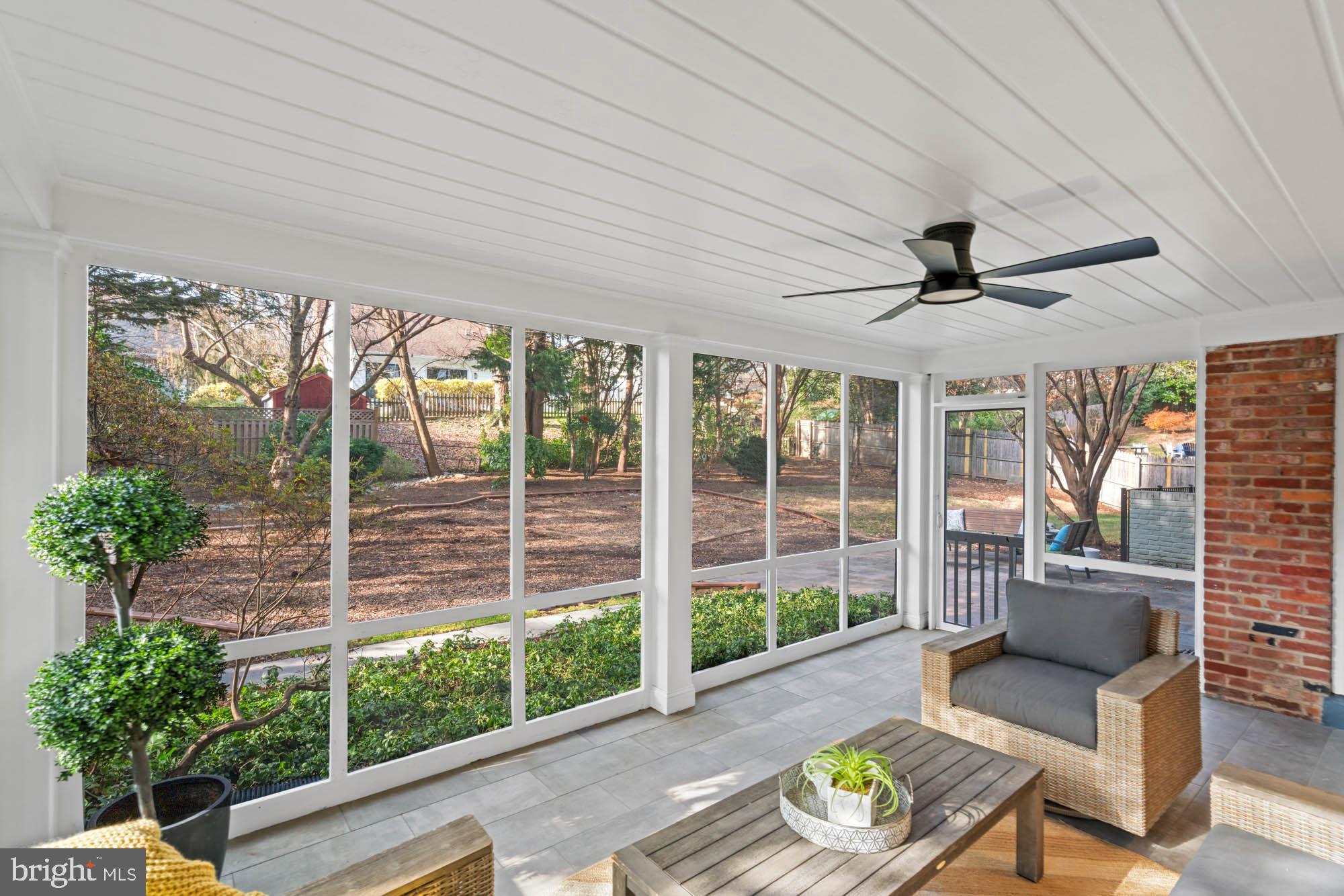 The main floor shines with gleaming hardwood floors and a magazine-worthy kitchen, featuring all-new windows that flood the space with natural light. This chef's kitchen is a showstopper, boasting high-end appliances, a five-burner range with a custom hood, a built-in microwave, and a paneled refrigerator/freezer. The formal dining room, with oversized sliding glass doors, opens to the screened porch and a flagstone patio, making indoor-outdoor entertaining a breeze.