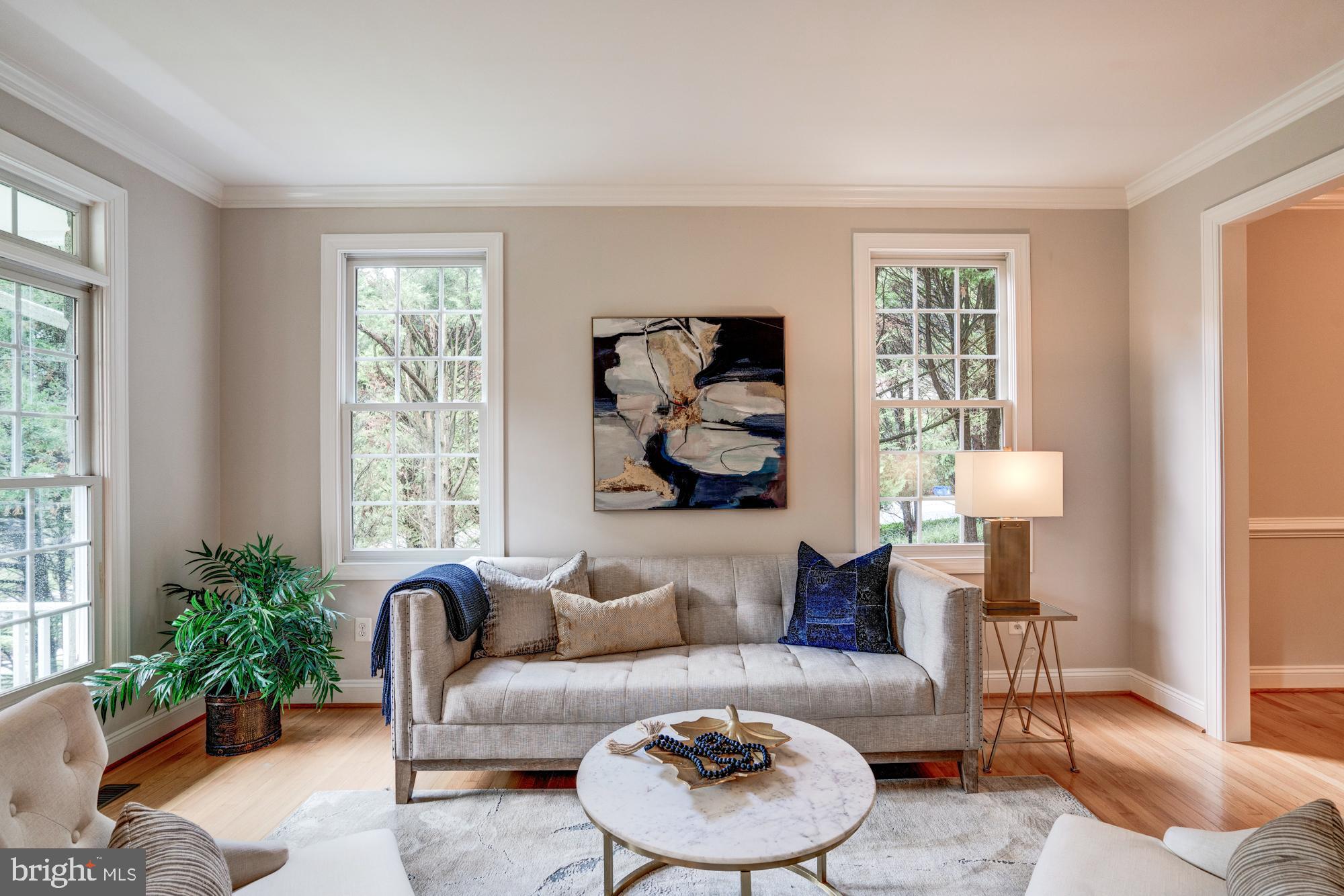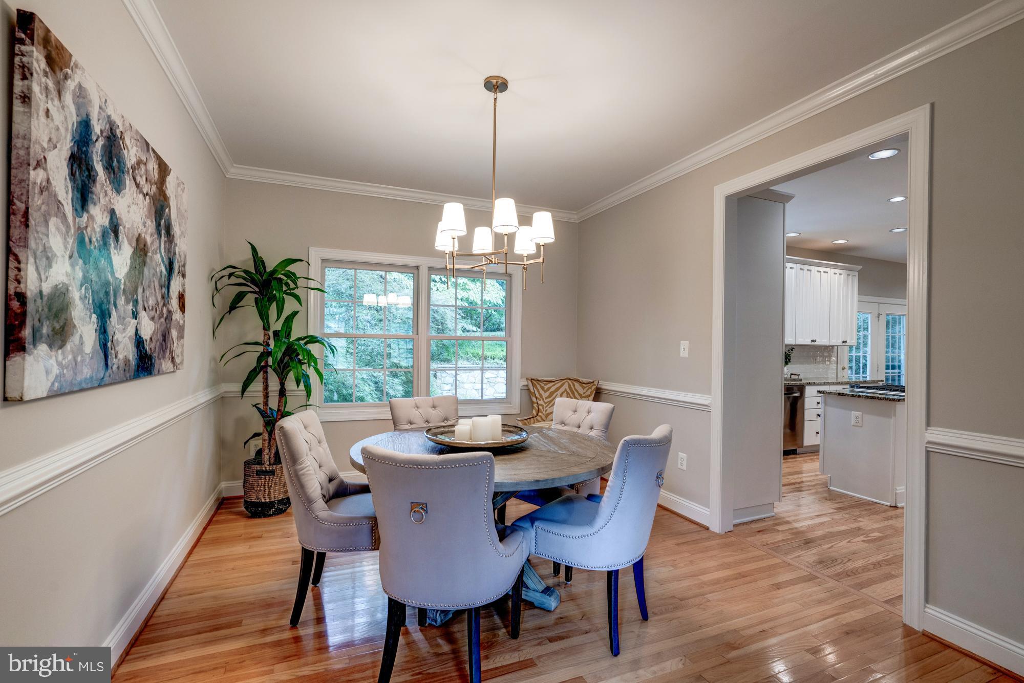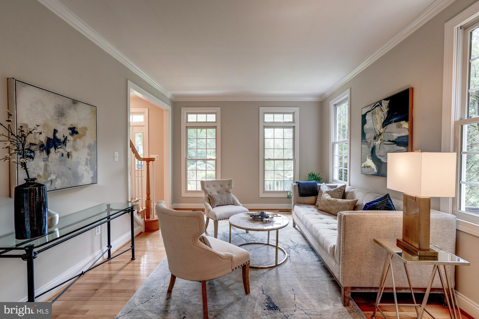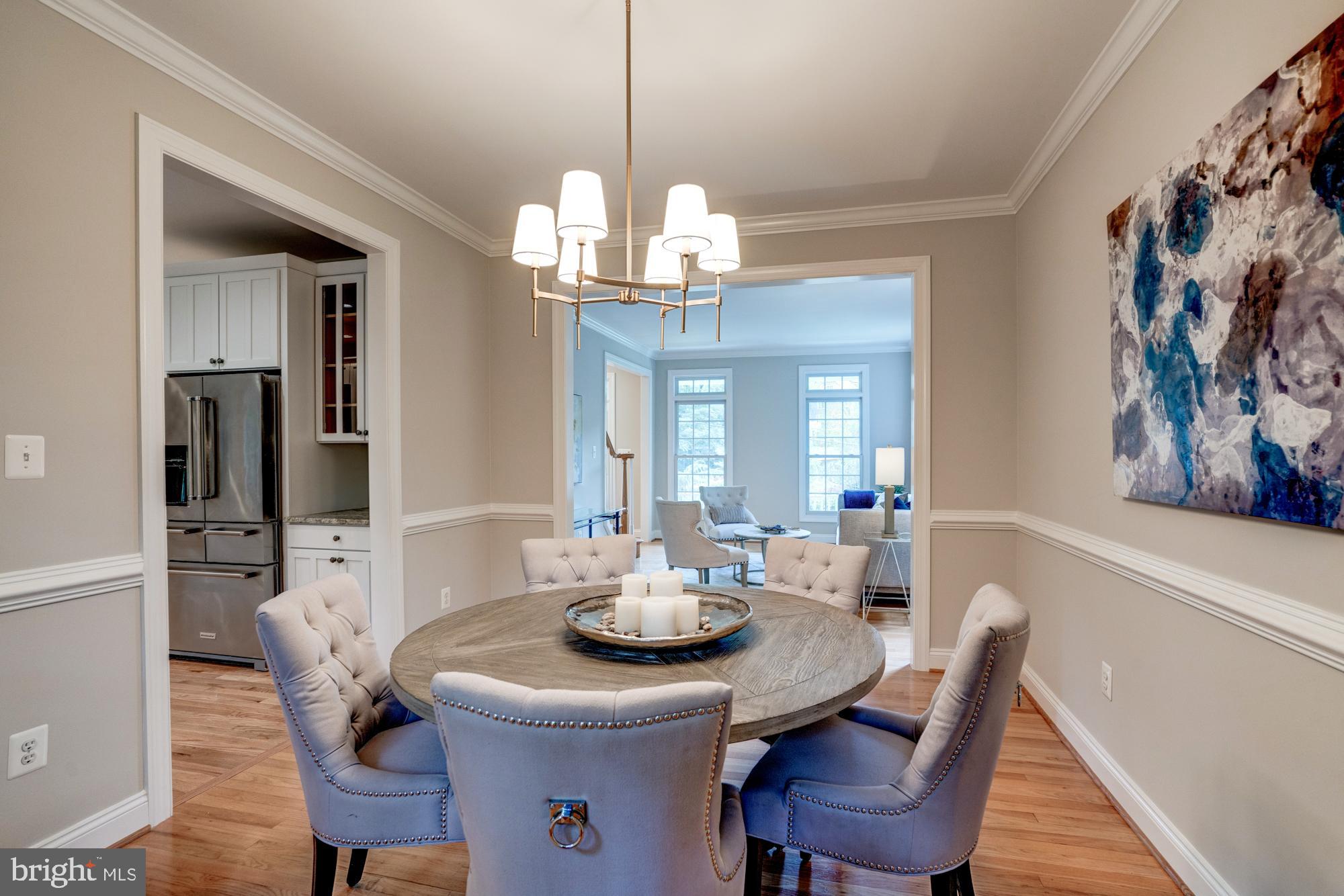 Boasting excellent flow with generous room sizes and beautiful details, including oversized windows, crown moldings, and hardwood floors. Approached by a flagstone walkway, surrounded by a lush front yard with boxwoods, leading to a handsome front covered porch with stonework and recessed lighting. This exemplary home enjoys a dedicated, center-hall foyer, as well as sun-drenched formal living and dining rooms. The spacious kitchen features a center island, stainless steel appliances, and a lovely breakfast room with access to the back patio with a tiered stone wall and beyond to the expansive fenced-in backyard with mature trees and shrubbery. The family room is centrally located off of the kitchen and enjoys a floor-to-ceiling stone fireplace. Additional highlights include a convenient first-floor laundry room and powder room, as well as a home office with a wrap-around built-in desk and shelving.