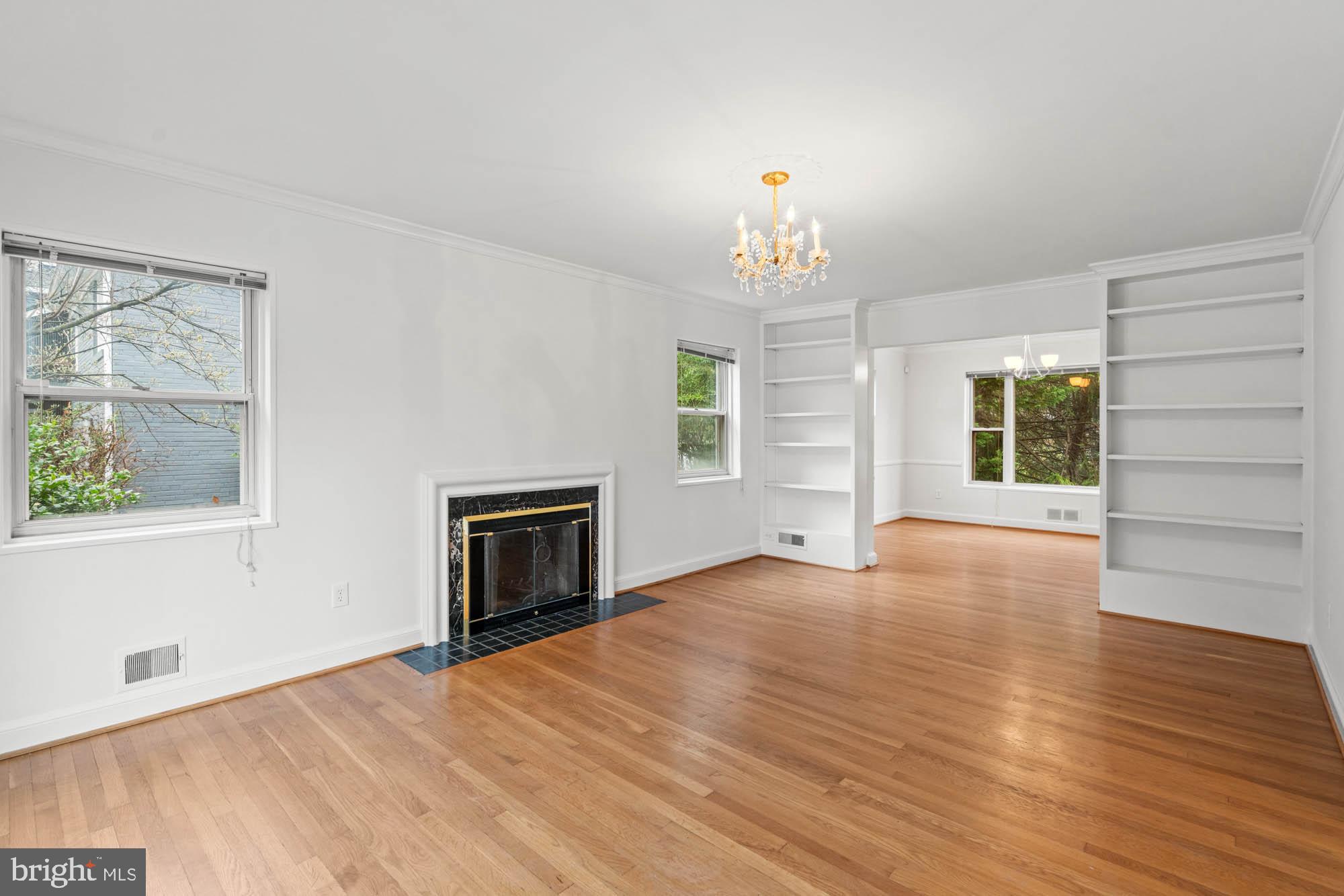 The welcoming first floor boasts gleaming hardwood floors, crown moldings, a gracious and sun-drenched living room with built-ins and a handsome fireplace, as well as an adjoining formal dining room also with oversized windows and chair rail molding. The functional kitchen sports calming, neutral tones, ample counter space, a breakfast bar, as well as a range and built-in microwave. There is a purposeful door to the lovely back patio and private yard, perfect for dining and relaxing al fresco and entertaining small or large gatherings.