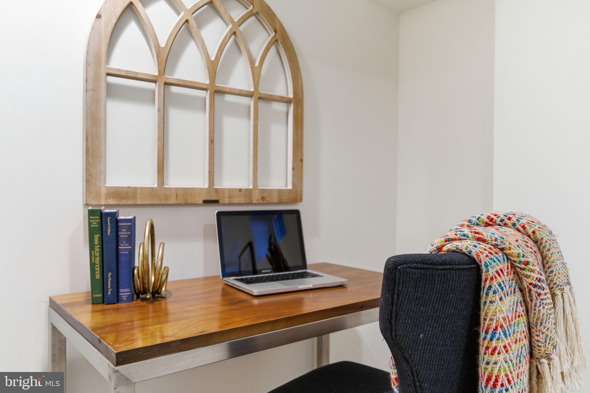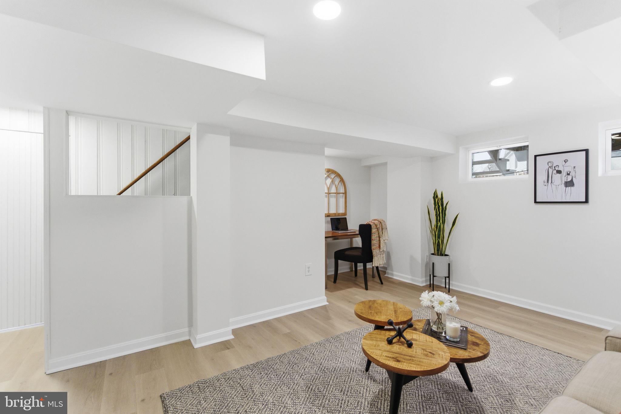The lower level offers a finished family room with a built-in office nook, an additional powder room, laundry, and ample storage. There is room to add a shower to create a full bath or finish the space for another legal bedroom.